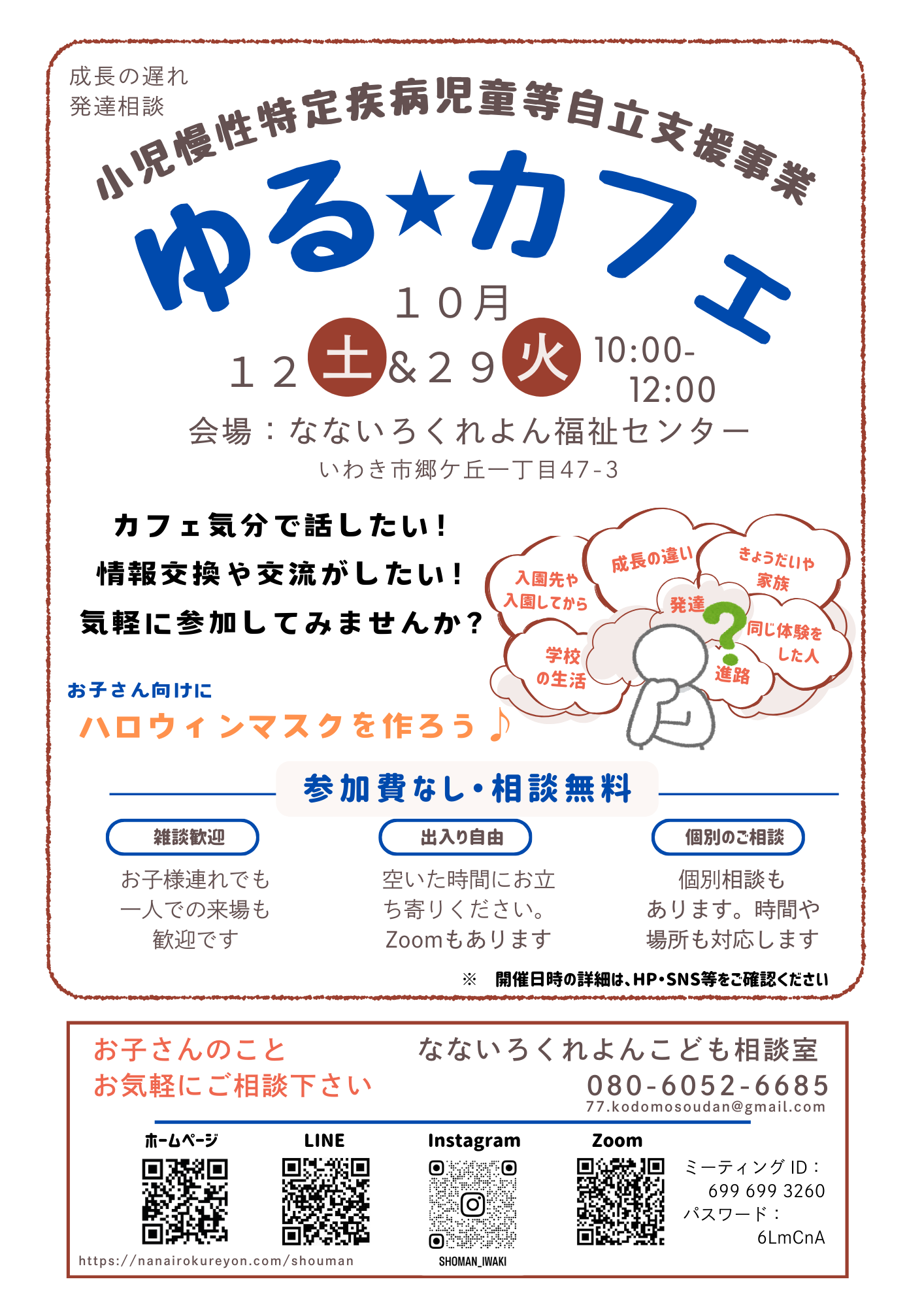 ゆるカフェ 2024年10月21日 最終更新日時 : 2024年10月21日 nanairokureyon 開催日: 2024年10月29日 平日にもゆるカフェ開催します。 土曜日は、紙皿を切って色を塗ったり折り紙を貼ったりしての工作を行いました。 今回は、色画用紙を折ってできるかぼちゃのマスクを作ってみようかなって思います。 折りたためるので、たたんで持ち運んだりしまえるので便利。 お子さんに作ってあげるのもいいかもしれないですね。